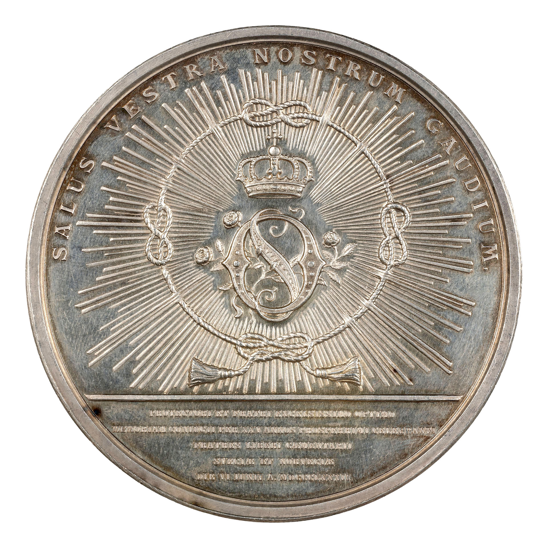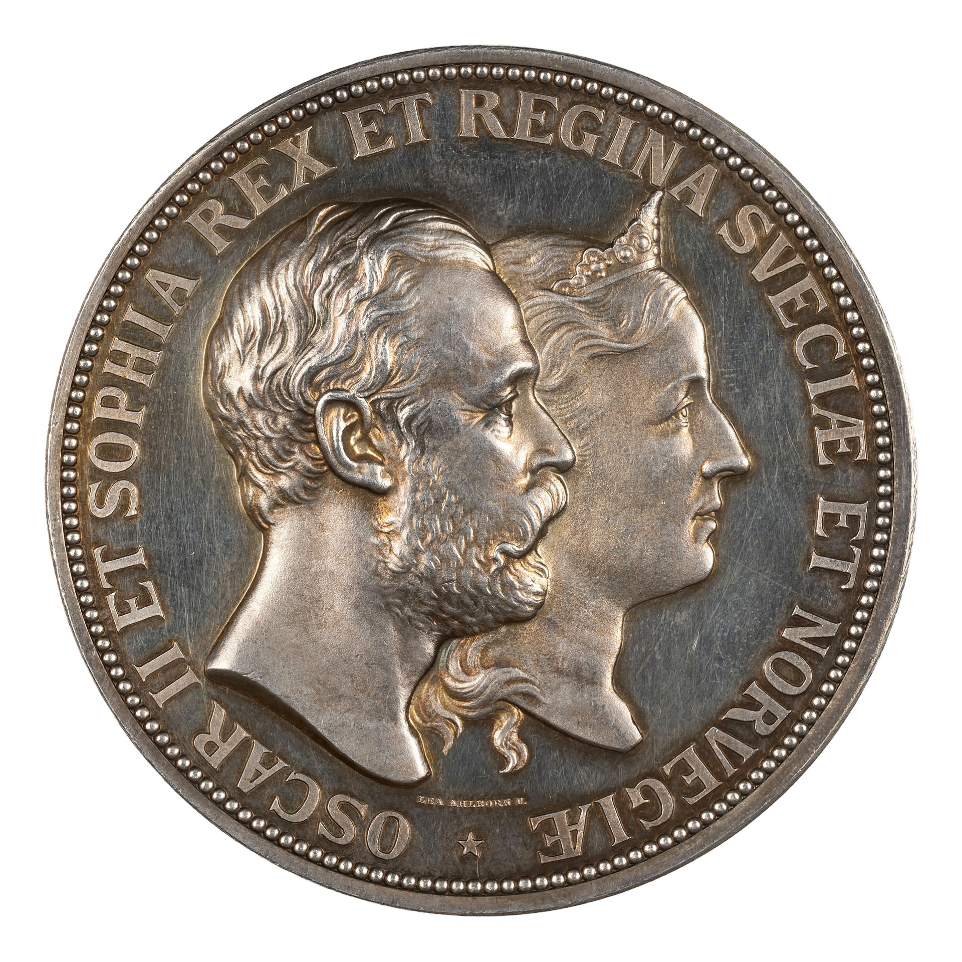 Oscar II och drottning Sofias silverbröllop firades 1882, 25 år efter deras giftermål 1857. Äktenskapet symboliserade en trygg, borgerlig familj i ett Sverige under en tid av snabb industrialisering och teknisk utveckling. Paret fick tillsammans fyra barn: Gustav, Oscar, Carl och Eugen. Medaljen framställdes på uppdrag av Coldinu-ordern. Från deras hemsida: “Ett uråldrigt brödrasällskap med ursprung i ett sydligt land, men som fortlever sedan mer än 250 år endast i Sverige och Finland. Orden har 1.300 medlemmar samt har värderingar och traditioner som vilar på kristen grund. De historiska ritualerna – som är symboliska och allegoriska – är i stort desamma som för 250 år sedan samt innehåller en mening som Bröderna bör begrunda och som kan ha betydelse för individen.”