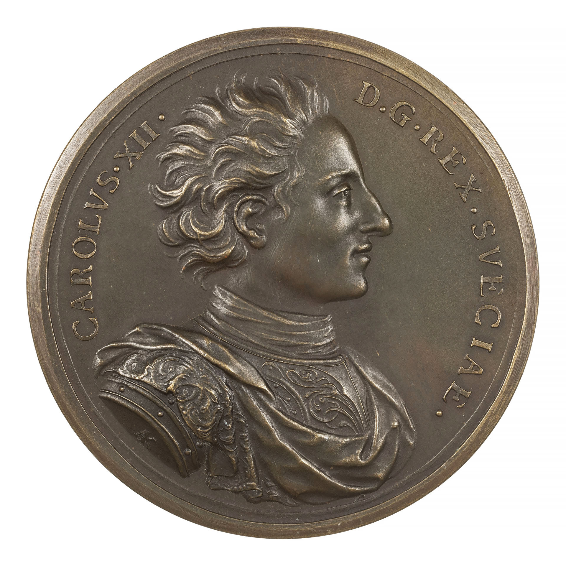 Åtsida: CAROLVS. XII. D. G. REX. SVECIAE. Högervänd bröstbild över konungen, iklädd prydligt harnesk, brämade mantelveck och omlindad halsduk. Under armen: AK