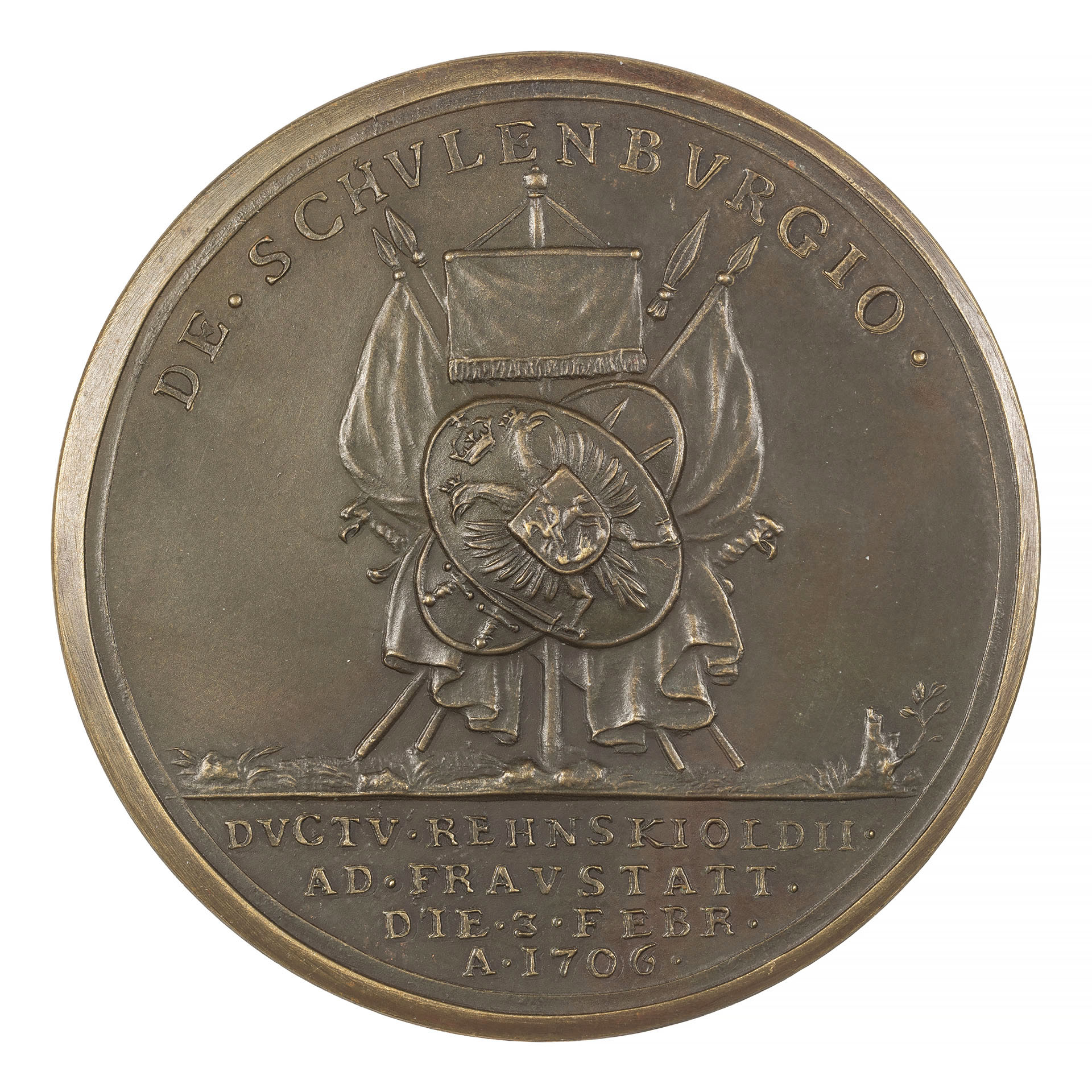 Frånsida: DE. SCHVLENBVRGIO. En upprest trofé af fanor och vapen samt Rysslands och Sachsens korslagda vapensköldar. I avskärningen: DVCTV REHNSKIOLDII AD FRAVSTATT DIE 3 FEBR A 1706